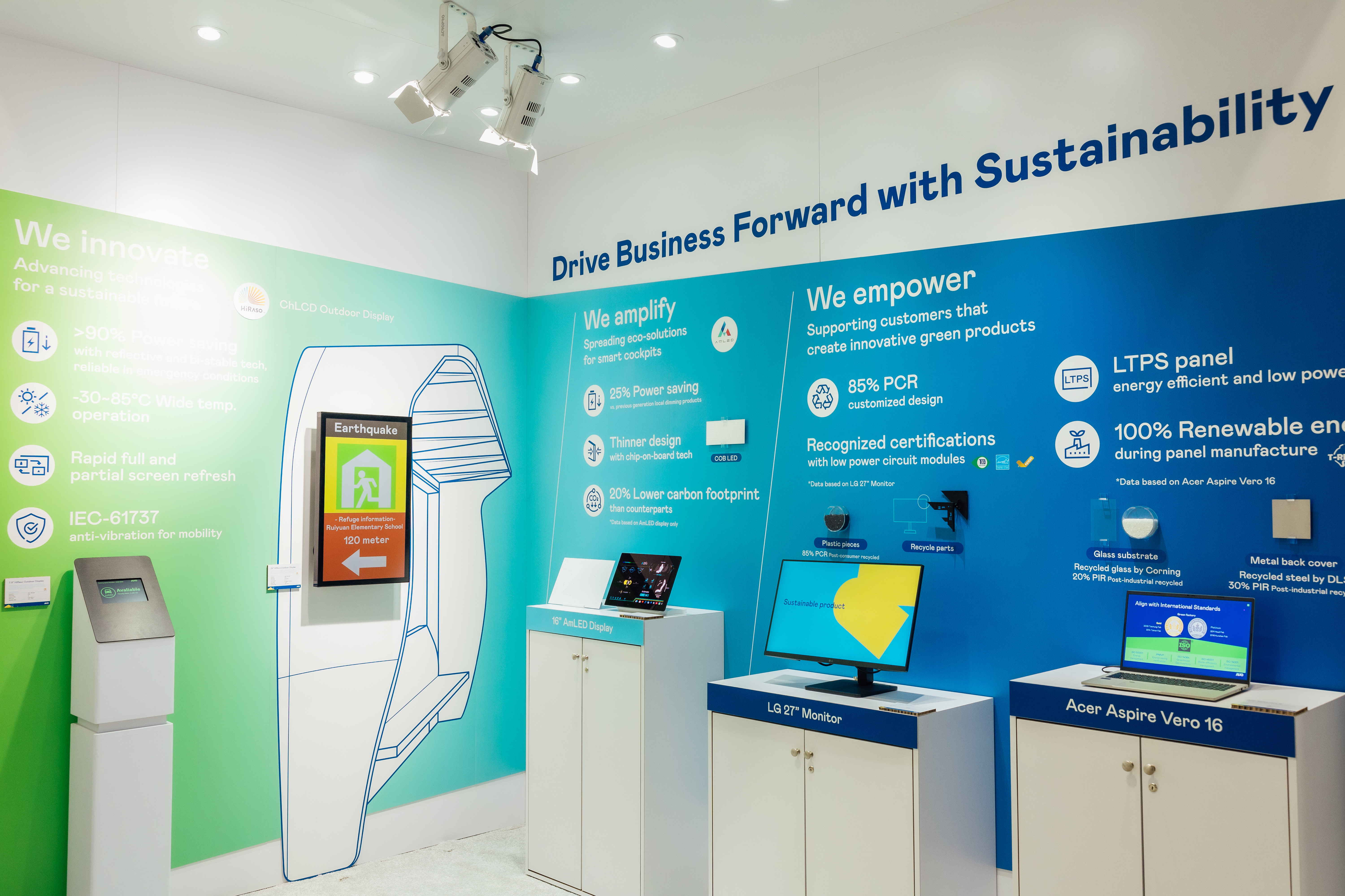 LEYU官網運用創(chuàng)新顯示技術HiRaso膽固醇液晶雙穩(wěn)態(tài)技術達到顯示零耗能、擴大節(jié)能省電的AmLED顯示技術應用于車用LEYU官網、以再生的消費后回收(PCR)塑料及全綠電生產之面板,應用于筆電及螢幕,增加綠色價值。